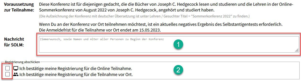 Bitte als Vor-Ort-Teilnehmer zuerst das Nachrichtenfeld (1) ausfüllen und danach den Haken (2) für die Bestätigung setzen.